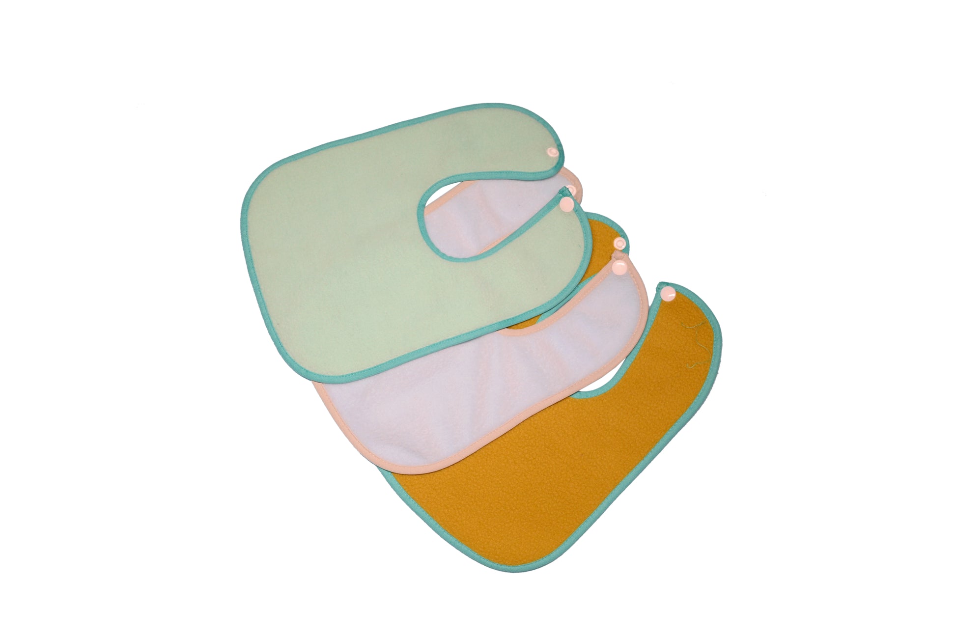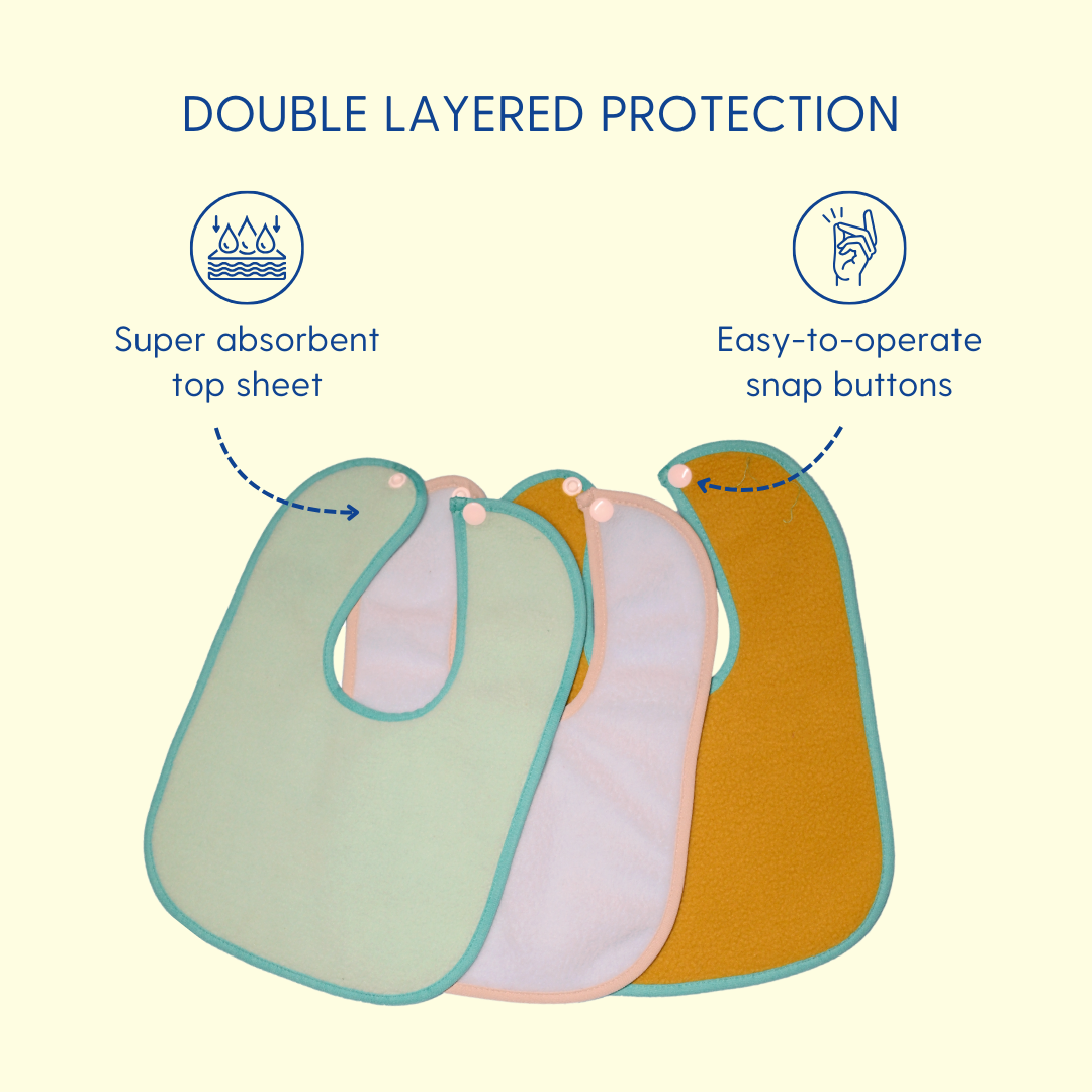Crafted with snaps, these bibs ensure a snug, comfortable fit. Made from soft, water absorbent fabric, they’re perfect for keeping your baby clean and dry during meals.