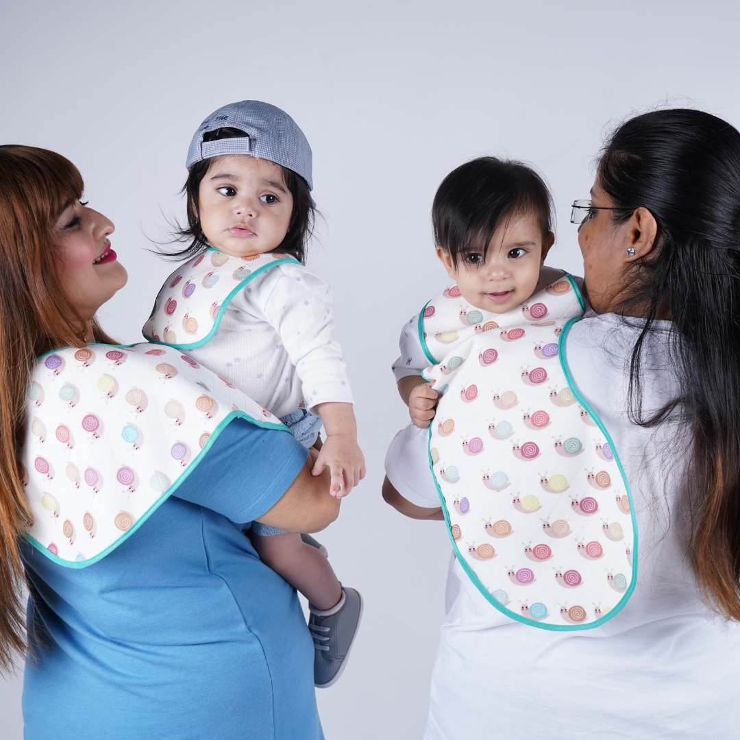 Burp time can get really messy with drool or spit-ups, hence our burp towel is designed to effectively cover the entire shoulder, to soak up every drop of the spill or spit up that occurs during burping. The soft burp cloth is 2 layered cotton which is absorbent, does a gentle and quick clean up.