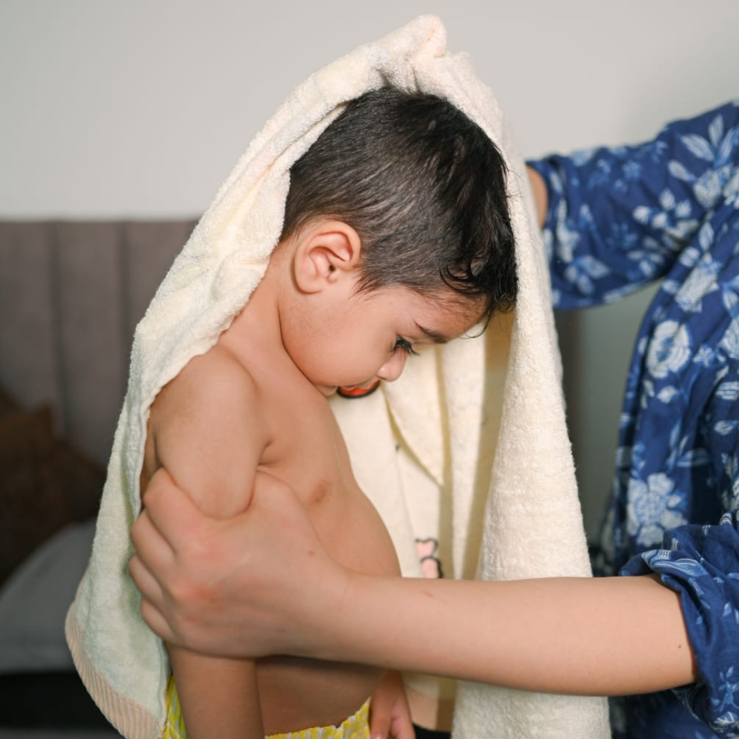 Gently pat your baby’s skin with the towel to absorb moisture, avoiding rubbing to protect their delicate skin.